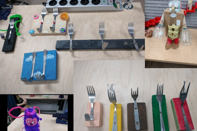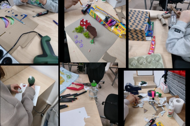 Szczególną uwagę poświęcono również tematom ekologii i troski o środowisko. Podczas zajęć świetlicowych uczniowie pracowali w duchu upcyklingu, tworząc nowe przedmioty ze starych materiałów: ozdobne pudełka, pojemniki, zabawki, a także makiety i prezenty na Dzień Matki czy Ojca. W pracowni technicznej drugie życie zyskały plastikowe pojemniki, kawałki metalu i zapomniane kartki papieru – wszystko zostało przetworzone w piękne i funkcjonalne dzieła, co nie tylko rozwijało kreatywność uczniów, ale też uwrażliwiało ich na znaczenie zrównoważonej gospodarki zasobami.