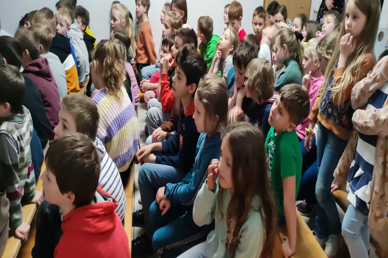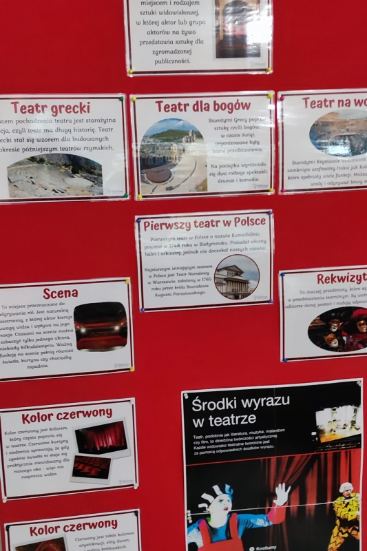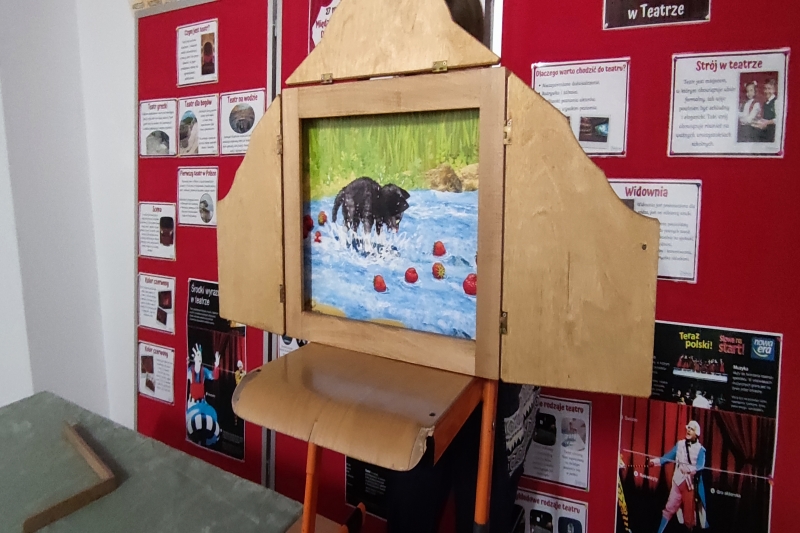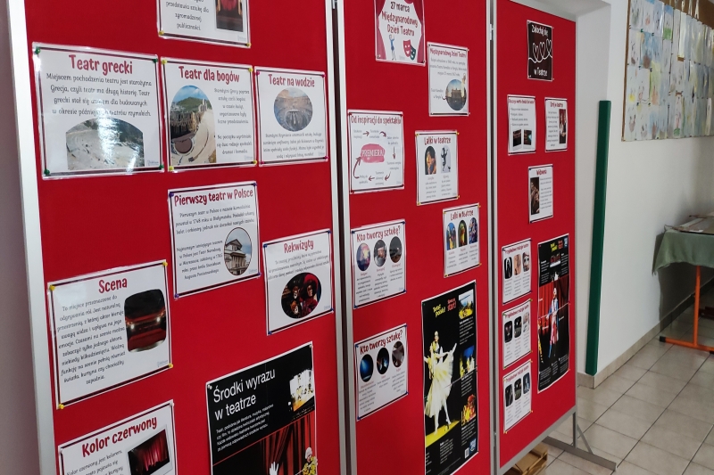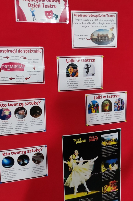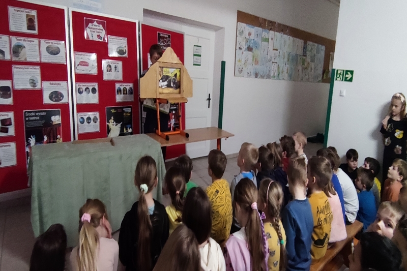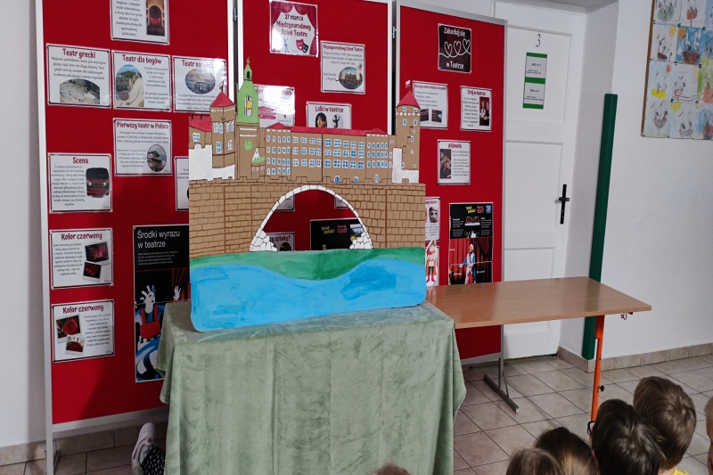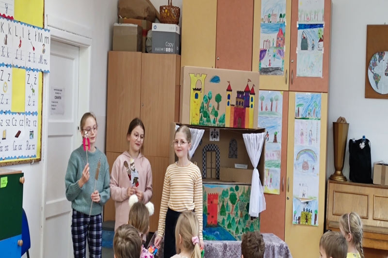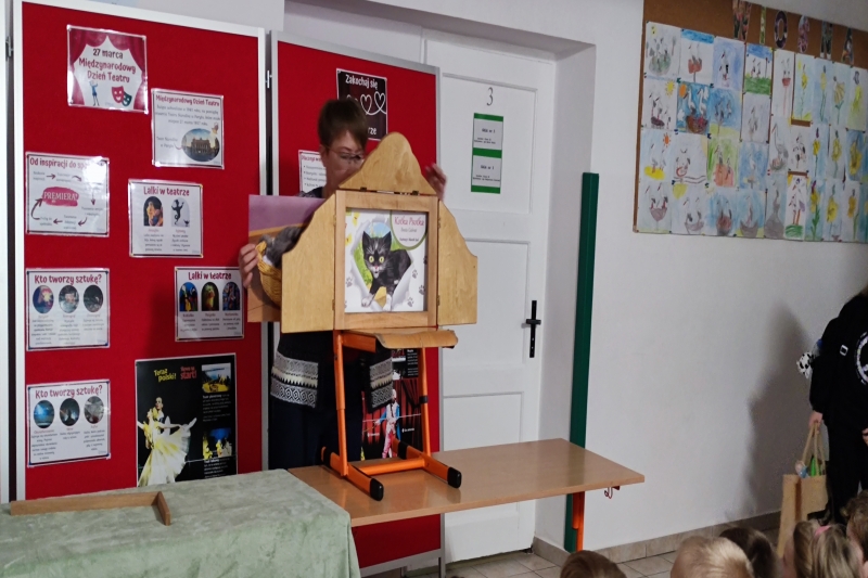 Z okazji Międzynarodowego Dnia Teatru uczniowie klas 1 - 3 uczestniczyli w zajęciach bibliotecznych, poświęconych dziedzinie sztuki muzy Melpomeny. Zobaczyli przedstawienia kukiełkowe o smoku wawelskim oraz o złym księciu Popielu i myszach w wykonaniu koleżanek z klas czwartych. Na zakończenie wysłuchali w teatrzyku kamishibai baśni o soli oraz przygód kotki Psotki.