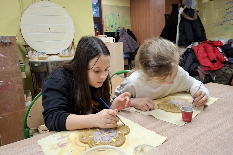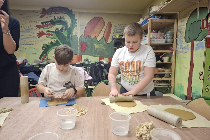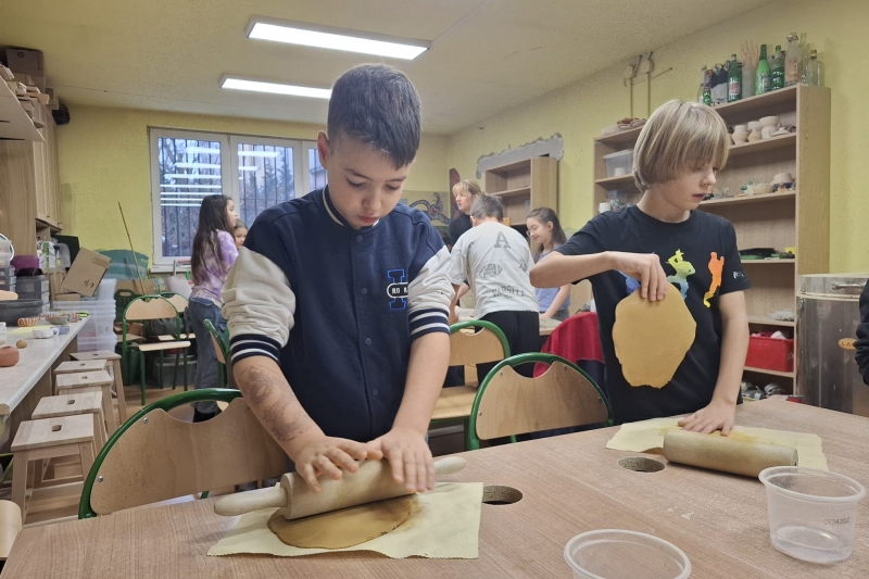 Podczas warsztatów ceramicznych w Staromiejskim Centrum Kultury w Krakowie dzieci z klasy 3a wykonały z gliny kubki i talerze.