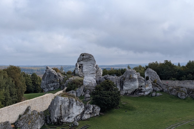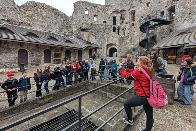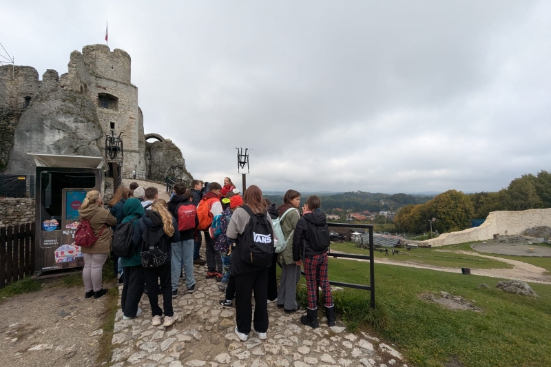 W środę, 8 października, uczniowie klas 5a i 6a wyruszyli na wspólną wycieczkę szlakiem Orlich Gniazd. Pierwszym punktem programu było zwiedzanie ruin zamku w Rabsztynie, gdzie uczniowie poznali historię tego niezwykłego miejsca. Następnie grupa udała się do Ogrodzieńca, by zobaczyć jeden z najbardziej znanych zamków w Polsce. Pani przewodnik opowiadała wiele ciekawych legend związanych z tym zamkiem – o duchach dawnych rycerzy, ukrytych skarbach i tajemniczych podziemiach. Nie zabrakło również czasu na zakup pamiątek. Na zakończenie dnia wszyscy spotkali się przy ognisku u podnóża zamku Pilcza w Smoleniu, gdzie wspólnie piekli kiełbaski i dzielili się wrażeniami z wycieczki. Chociaż wycieczka rozpoczęła się w obłokach mgły, pogoda i humory dopisały, a dzień pełen historii i legend na długo pozostanie w pamięci uczestników.