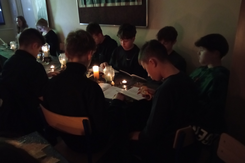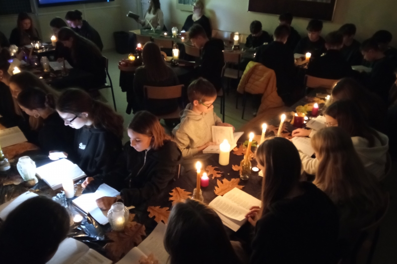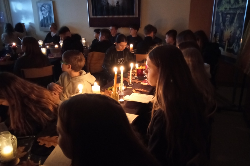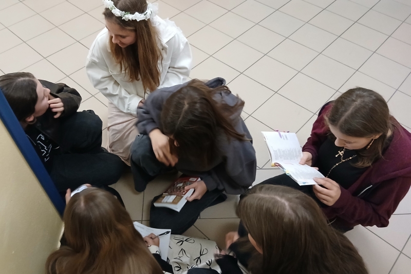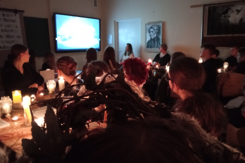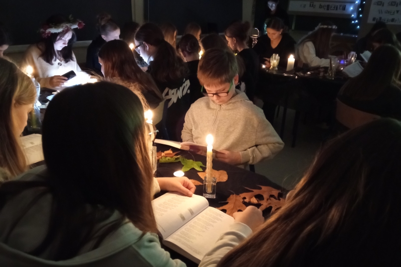 We środę 5. listopada w naszej szkole odbyło się WIECZORNE CZYTANIE „DZIADÓW” Adama Mickiewicza. Uczniowie klas siódmych obejrzeli dwa krótkie filmy o tym słowiańskim obrzędzie i zobaczyli samego Wieszcza, który snuł opowieść na temat tradycji naszych przodków. Następnie, aby wprowadzić się w odpowiedni nastrój, wysłuchali rockowego utworu grupy Hard Rockets pt. "Elektryczne Dziady". Główna część spotkania, czyli czytanie dramatu, wymagała dużego zaangażowania siódmoklasistów, którzy odpowiedzialnie podeszli do zadania: zadbali o odpowiednie stroje, dekorację oraz właściwą interpretację głosową utworu. Na koniec uczniowie zostali podzieleni na grupy i wykonali zadania związane z treścią dramatu. Każdy uczestnik gry otrzymał ocenę celującą z języka polskiego.