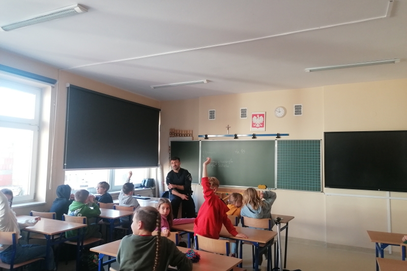 14 listopada 2025 r., w ramach projektu "Życie z pasją - inspirujące spotkania z ciekawymi ludźmi" klasy czwarte spotkały się z aspirantem Adrianem Firkiem - dzielnicowym komisariatu w Świątnikach Górnych.